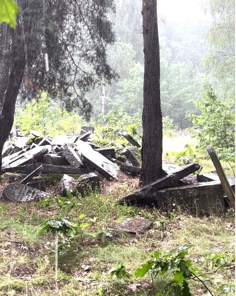 The Bródno cemetery, across the river in Praga, was the poor people’s cemetery. Whereas most of the matzevahs still stand in Okopowa, in Grodno they lie on their sides in piles, they are formed into caged walls, they recede further and further into the earth. As I walked around alone, the sky split open and I was caught in the middle of a downpour. I continued walking around, the rain dripping down from my hair and skin and clothes into the earth were the dead were resting. I felt undone by the destruction of the cemetery, by the idea that people were now lying in unmarked graves, that even the dead are not safe from genocidal terror. And that even the dead are not safe from having their memories exploited for the sake of genocidal terror. I thought of 20 years from now, when markers are put up to mark the genocide in Gaza and everyone pretends that they, too, were helpless to stop it. I thought of the layered deaths, the one of leaving the mortal realm, and the one of leaving memory, and the one of not being marked anymore. And yet, the rain was still able to reach them, dripping from the sky to me to the dead.