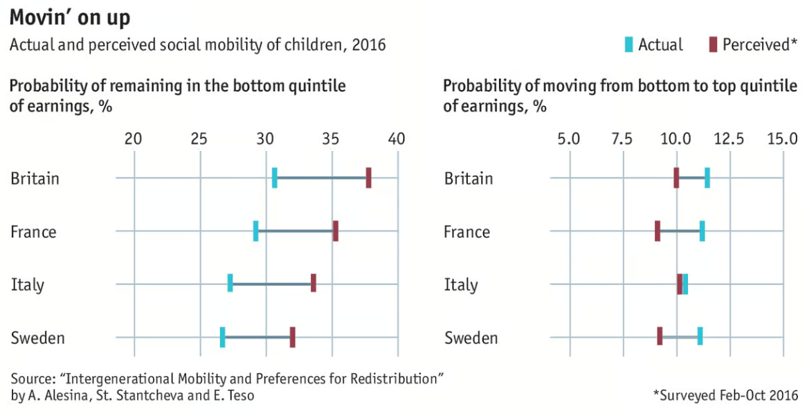 "While most of the world is skeptical that they can improve their fortunes, Americans both overestimate their odds of climbing from the bottom 20% to the top 20% and underestimate their odds of failing to escape the bottom".