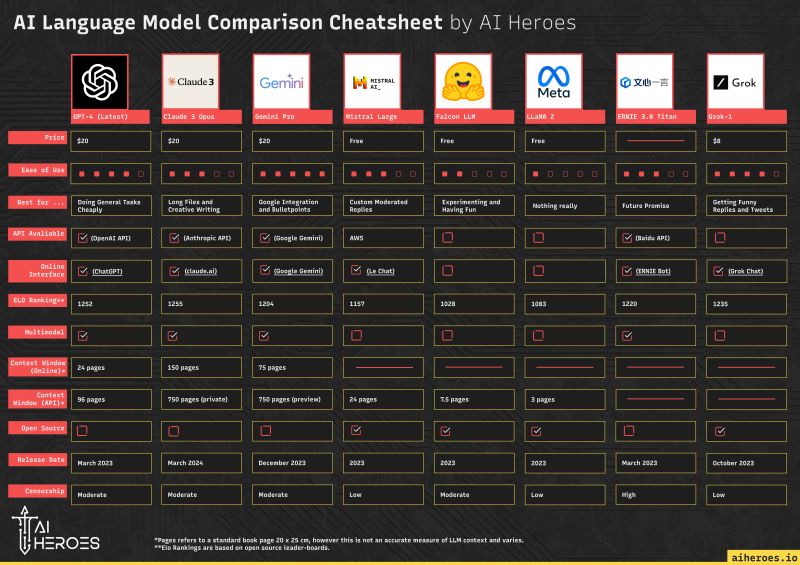 In the ever-evolving AI landscape, choosing the right large language model (LLM) is crucial for driving innovation and maintaining a competitive edge. Our team have created the ultimate cheatsheet comparing the industry's top LLM offerings. From GPT-4's extensive support systems to Claude 3 Opus' exceptional language abilities, this in-depth analysis dives into each model's unique strengths, context windows, censorship levels, and more. We’ve made sure to target the big names, and also promising up-and-comers.