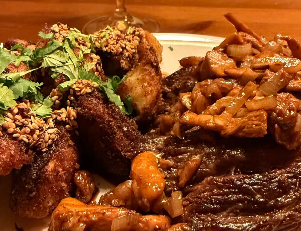 To fight off the feeling that winter was coming way too fast, I cooked it in a new fashion: roasted wrapped in aluminium foil for about 90min, hand-shredded into chicken-wing-sized bits, buttermilked, breaded with spices, shallow-fried with garlic and thyme, and finally coated with a home-made sesame teriyaki glaze.