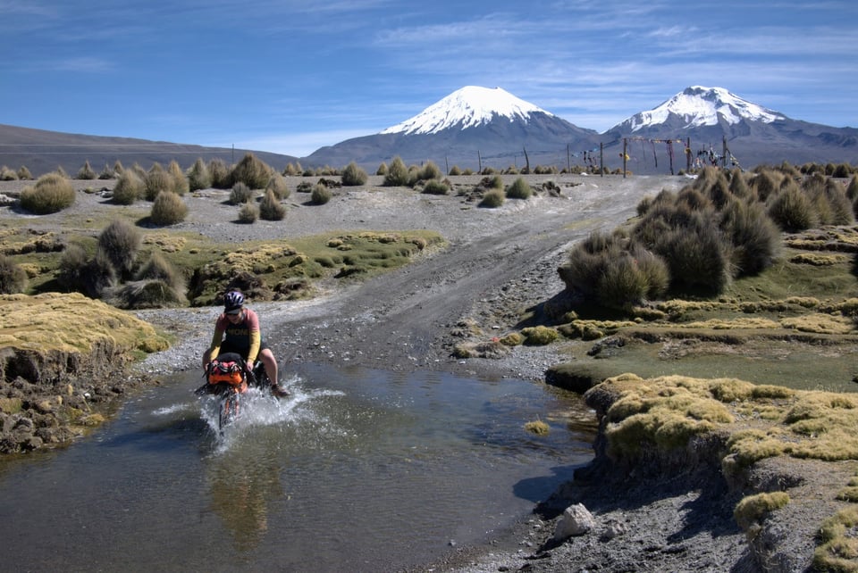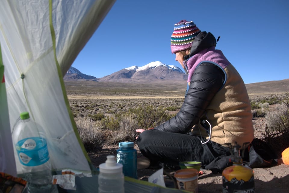 But arriving into Chile an epic view of Parinacota volcano opened up (it was to be our guardian, occupying the rear view mirror for four days), then we descended in the failing light, revelling in the success of smuggling a ton of illicit nuts over the border. We pitched our tents on a sandy slope as the sky turned pink and the alpacas looked on curiously. Then we settled in for a cold night and I woke up at 3pm with frost on my wooly hat.