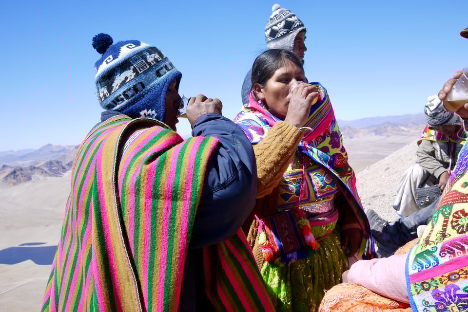 I must say, I did feel something akin to an enlightened moment. Although I understood only half of what was said, and am generally not a religious person, there was something special about taking part in a community offering words and goods to a higher power. And something incongruous about the women’s colourful shawls contrasting against the barren altiplano which expanded in all directions, thousands of metres below. Maybe it was the alcohol talking.