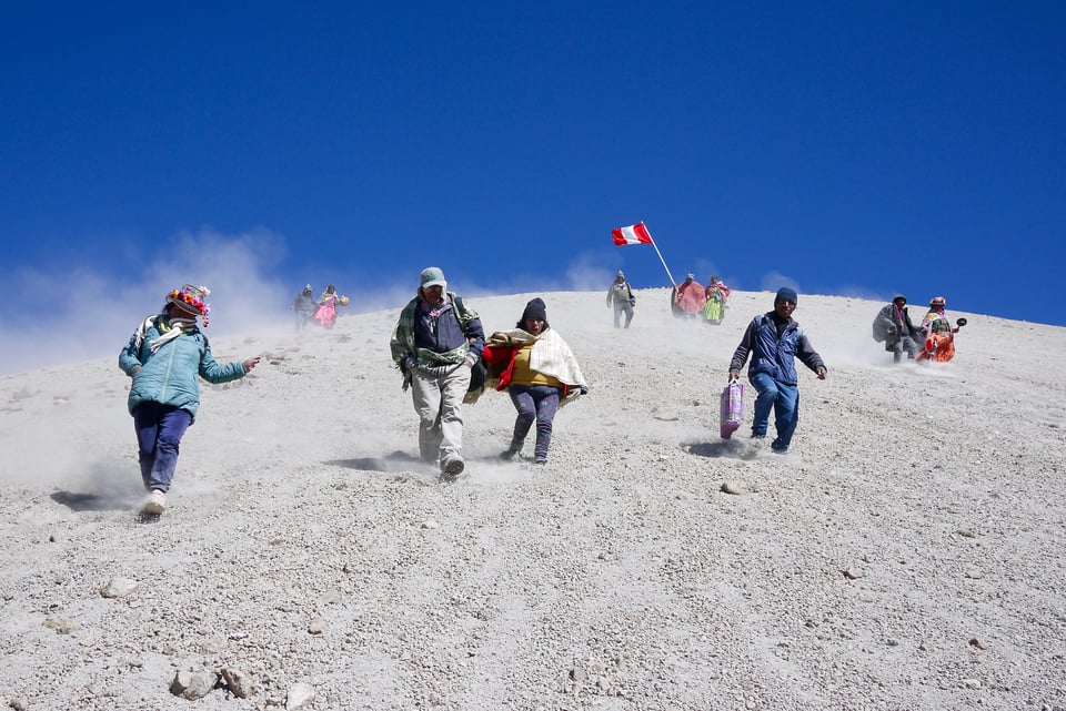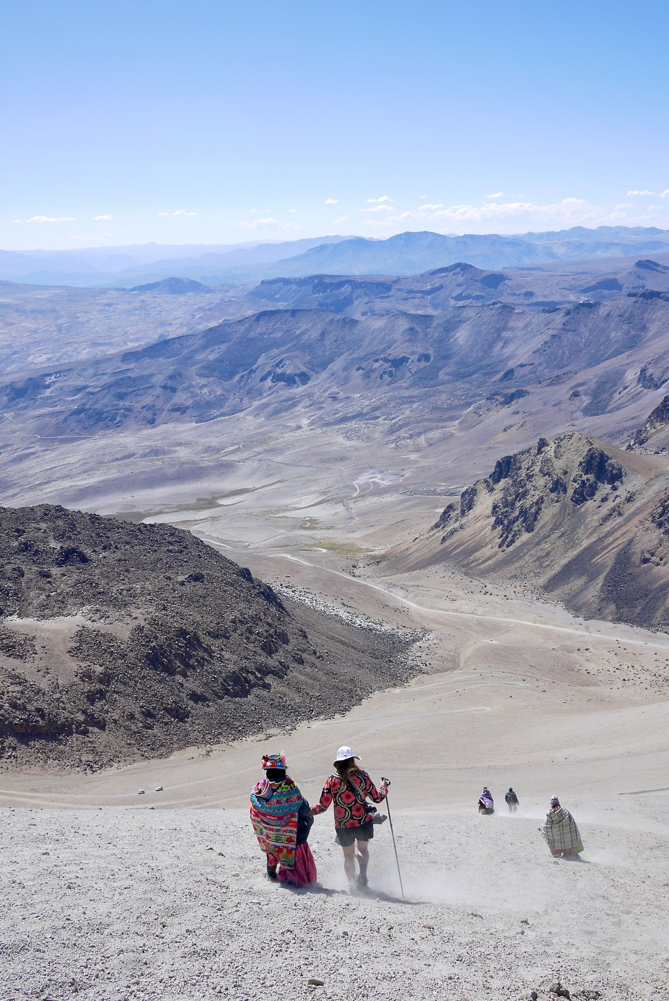 It’s midday on the first day of August and we’re running/foot-skiing/moon-walking straight down the soft pumicey slope of a volcano with fifteen people from the local town of Calacoa. The wind carries volcanic dust away from our footsteps. The red and white bands of the Peruvian flag are being proudly lifted by the leader at the back of the group. Some tread carefully but most run carefree, even the elderly. A few people sit in the pumicey earth for a breather. I offer my hand to a lady swaddled in shawls and skirts and we’re running again. I’m covered head to toe in dust, a bit tipsy, pretty breathless - this is so damn fun! How did we get here?