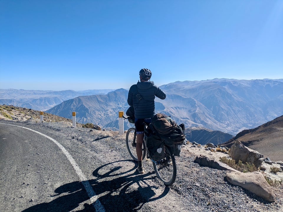 After these interactions and our Ticsani adventure it was mainly descending towards Arequipa. We entered the Rio Tambo Canyon which took our breath away. Words can’t do justice the scale of this place. We didn’t pedal for two days as we rolled down the newly tarmaced switchbacks which snaked down the valley sides. We didn’t pass a car in two days and the only people we passed were the orange-clad road workers touching up road signs.