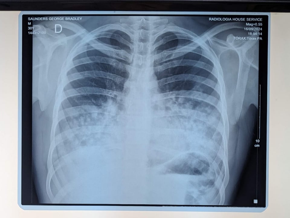 Then I was taken for blood tests and X-rays. At some point a needle was put in my stomach, I pissed in a cup, and I had these weird wires plugged into bangles and sticky cups stuck on my torso. The diagnosis was pulmonary edema - basically liquid on the lungs. The treatment was oxygen, antibiotics and rest.