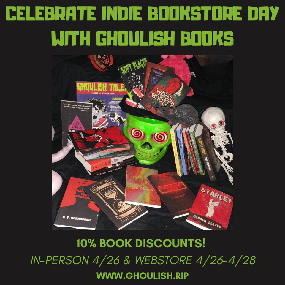 Uh, anyway…to celebrate, we have added a 10% discount to everything in our webstore. It will be automatically applied upon checkout. Head on over to our webstore GHOULISH.RIP to browse and shop. Reminder: our webstore contains not just books we’ve published but all the other books we have physically stocked in our store. We also have eBooks available for the books we’ve published through Ghoulish. The webstore discount expires Monday at 11:59PM CST.