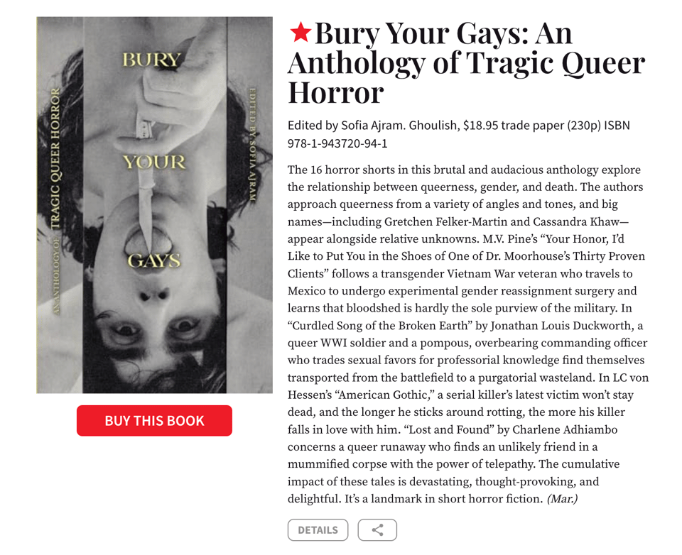 Our next publication, Bury Your Gays: An Anthology of Tragic Queer Horror (ed. Sofia Ajram), just received a starred review from Publishers Weekly!