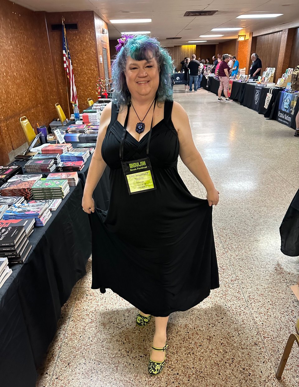 At the Ghoulish Books table, specifically, we sold a total of 398 items (includes books, shirts, & tiny coffins). A few people asked me if I thought we'd made a profit, and honestly it's unclear. So many different costs go into organizing a festival like this--from renting the venue, advertising, decorations, supplies, inventory restock, audio equipment, to travel/lodging for our guests of honor, to many other things, and none of that includes, like, the actual labor put into everything by myself and my wife Lori and our three volunteers Andrew, Miguel, and Zach (we do not pay ourselves to run the festival). In fact, next year (yes, we're continuing the festival) we will probably look into turning GBF into a non-profit and hopefully get help from the state as far as funding the event. But I promise I'm not complaining, even if I love to complain! The fest was a hit. Everybody, to the best of my knowledge, had a great time.