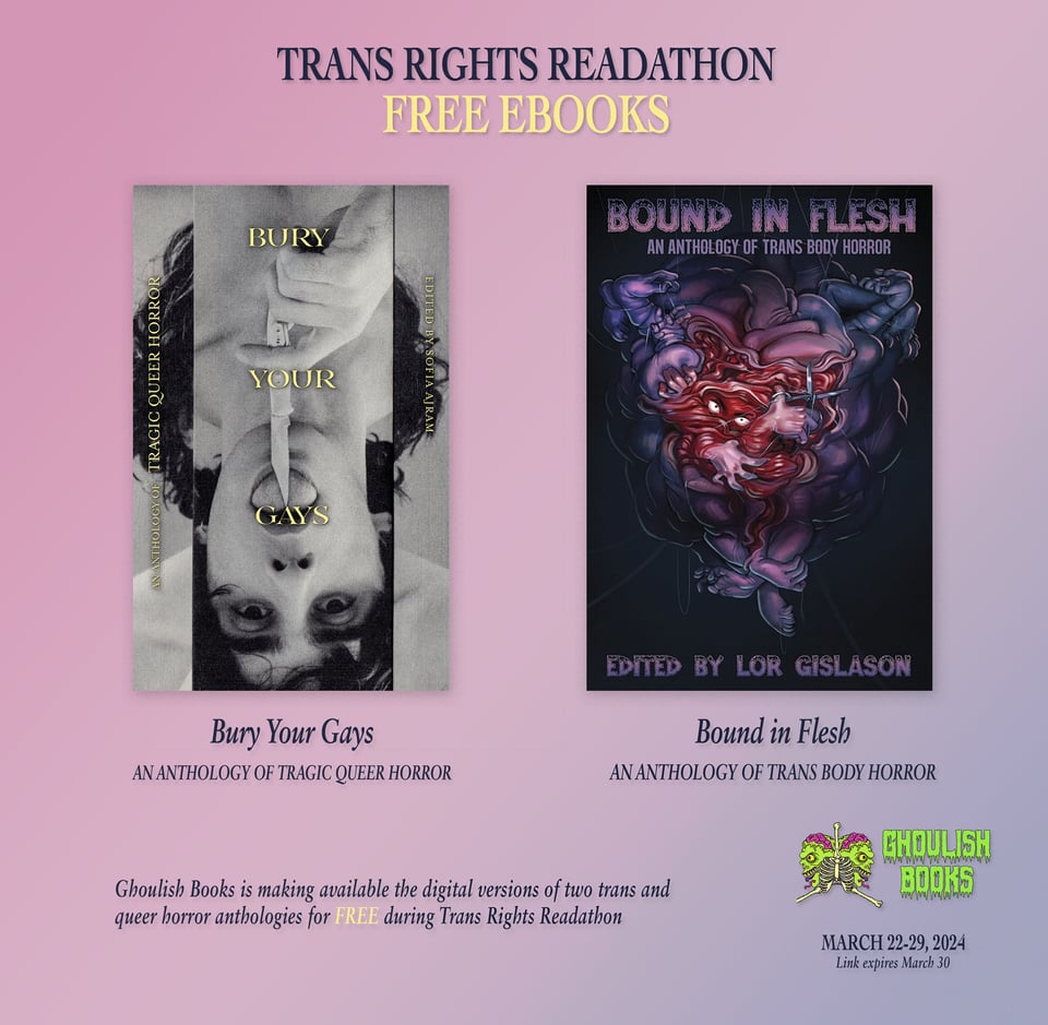 Additionally, we have made our 2023 anthology, BOUND IN FLESH: AN ANTHOLOGY OF TRANS BODY HORROR (ed. Lor Gislason), free to the public.