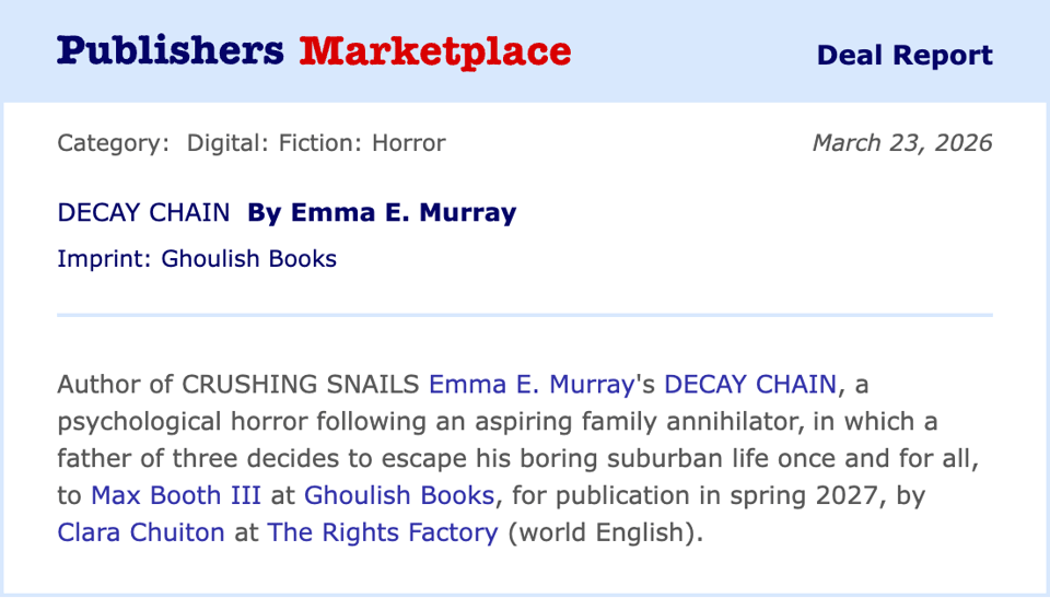 We are thrilled to announce Emma E. Murray's Decay Chain, a psychological horror novel following an aspiring family annihilator, in which a father of three decides to escape his boring suburban life once and for all. All paperback pre-orders will receive a signed author sticker from Emma E. Murray. Pre-order it TODAY and get a nice surprise a year from now.