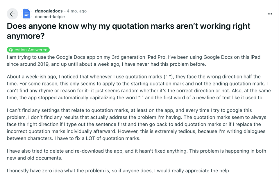 Earlier this Spring, while tabling at a popup event in the mall, I attempted to multi-task by also editing a manuscript with my laptop during customer lulls. At one point, someone texted me. I picked up my phone and immediately dropped it on my laptop keyboard, resulting in the laptop screen to just…implode. A couple days later, we managed to connect the laptop to a television screen and a bluetooth keyboard/mouse combo, which worked decently when the laptop was put into clamshell mode. So I brought my main desktop from the house to the shop, and used my clamshell laptop/TV at home. This wasn’t ideal but worked well enough, until last week (or was this the week before last?) while working on my next novel at home, a storm knocked our power out for just a couple seconds. Whatever this power outage did, it completely fried my previous laptop/TV system. It now refuses to connect like it once did. There’s probably about 1500 words on that computer that I’ve given up on saving. Thankfully just 1500. They probably weren’t even a very good 1500 words anyway, if we’re being honest. So then my system became writing on an iPad with an external keyboard using Google Docs. This worked okay except for one extremely annoying glitch that seems to be unfixable with the Google Docs iPad app when using an external keyboard. I’ll let this Reddit user’s post from over four months ago explain it, since it’s the exact shit I started experiencing: