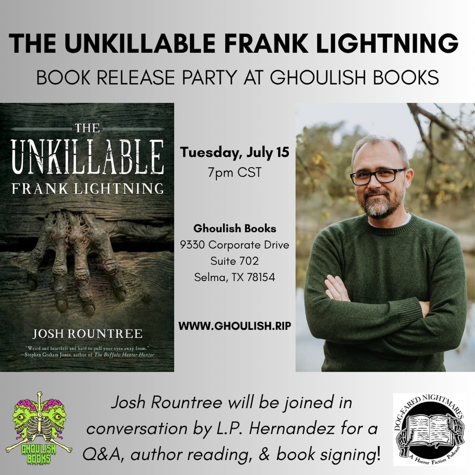 Join us at Ghoulish Books to celebrate the release of Josh Rountree’s new novel, The Unkillable Frank Lightning. Live author readings & signings! Copies of the author’s books will be available for sale at the shop. The Unkillable Frank Lightning can be pre-ordered HERE. Choose local pickup if you’d like to receive it during the event!