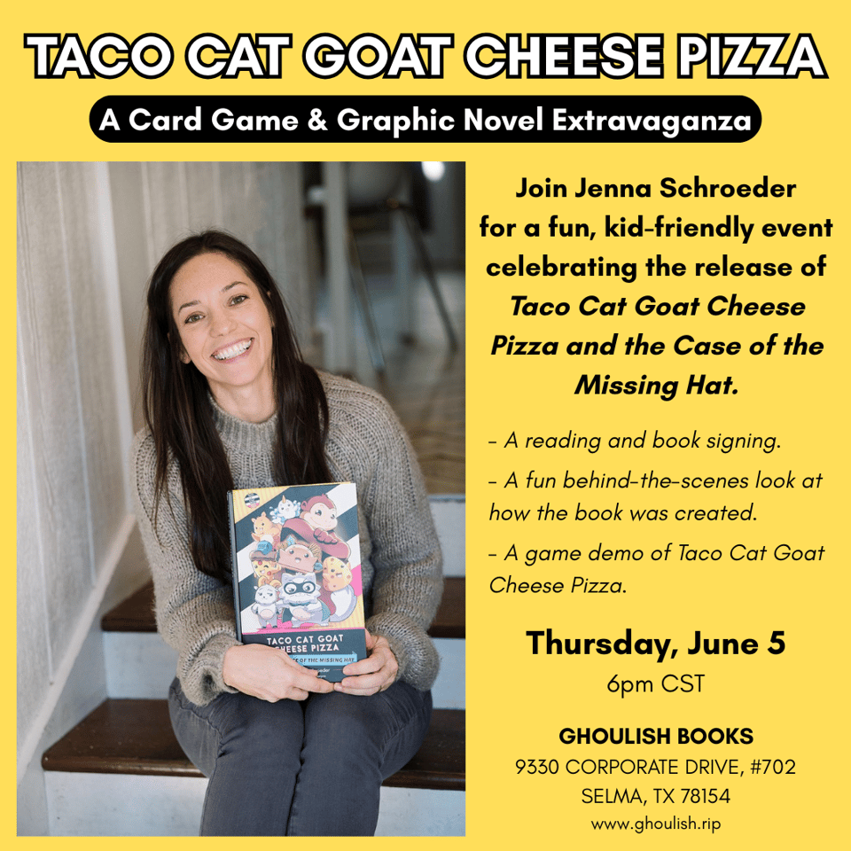 TACO CAT GOAT CHEESE PIZZA Card Game & Graphic Novel Extravaganza – Feat. Jenna Schroeder!