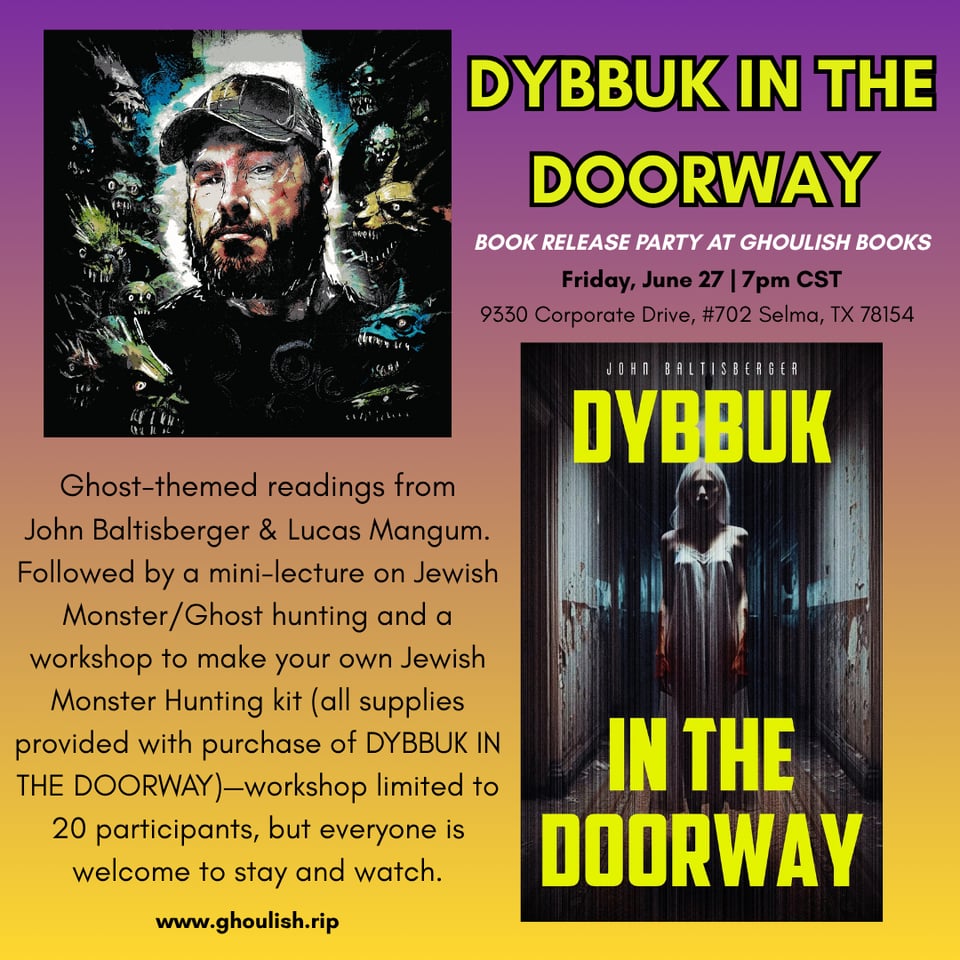 Join Lucas Mangum and John Baltisberger at Ghoulish Books in Selma, TX, to celebrate the release of DYBBUK IN THE DOORWAY, Baltisberger’s new supernatural horror novella from Anxiety Press.