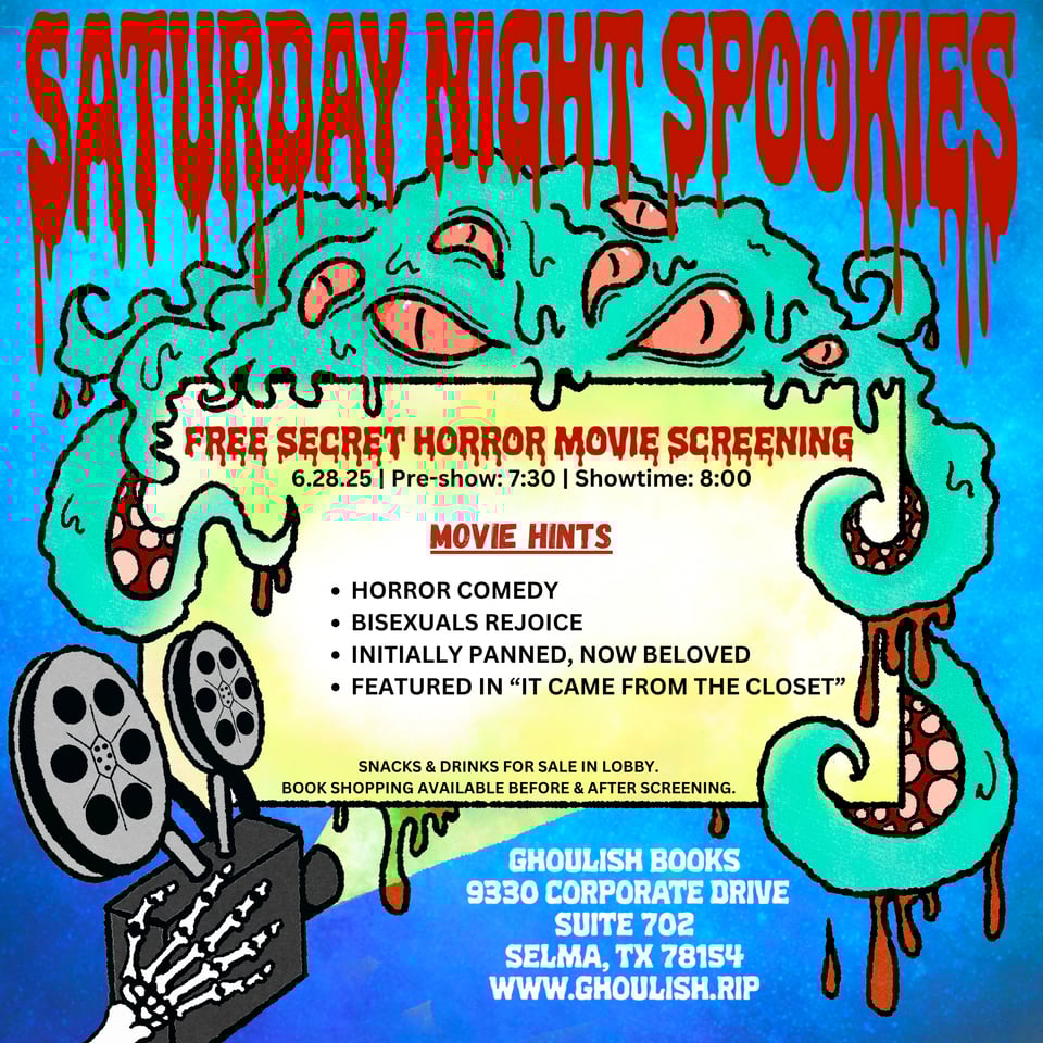 Saturday Night Spookies is our monthly movie screening event! On the last Saturday every month, we host a FREE secret movie screening in our bookstore. The movie title is always a secret until showtime.