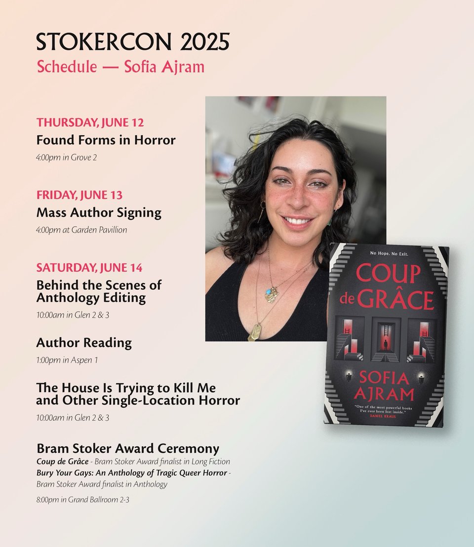 It was also nominated for a Bram Stoker Award! which I think will be decided…this weekend at Stokercon? is that right? oh shit, fingers crossed! I won’t personally be attending, but Sofia will be! Their novella COUP DE GRACE was also nominated! Check out his schedule below and say hi for me: