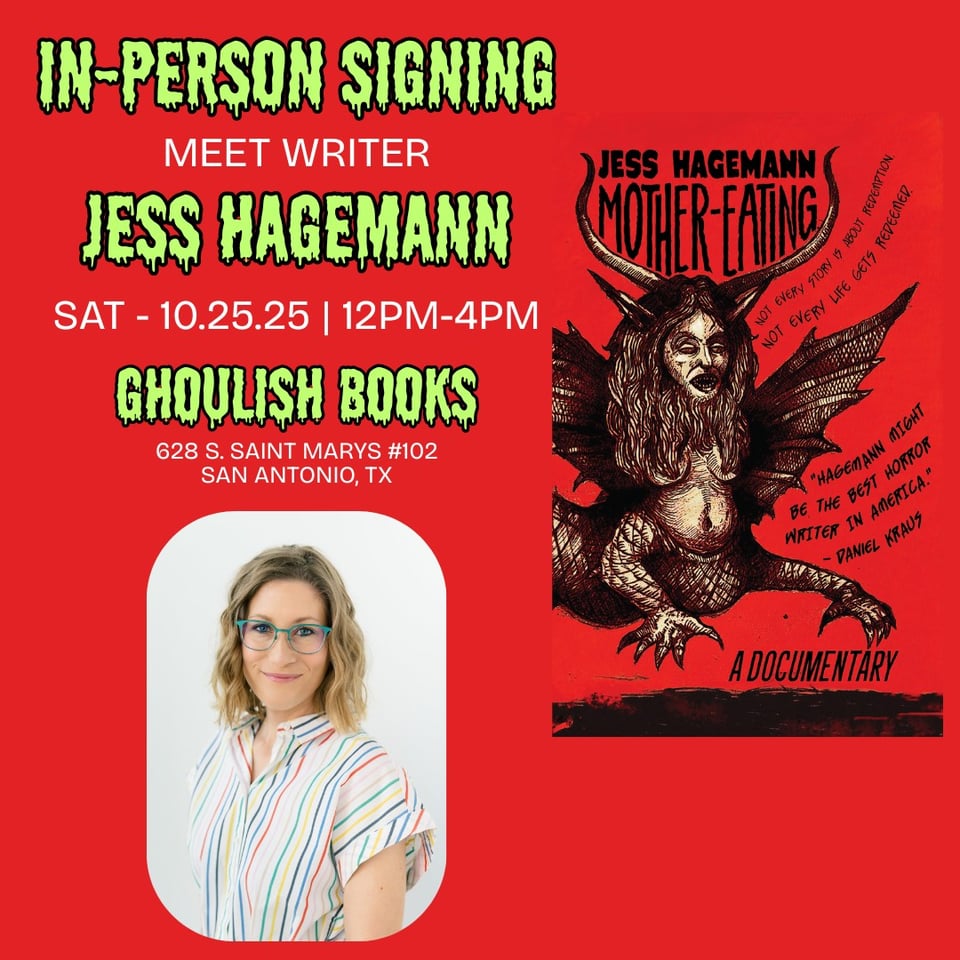 Jess Hagemann will be in-person at Ghoulish Books on Saturday, October 25th from 12pm-4pm to celebrate the release of her new novel Mother-Eating (published by Ghoulish Books!). Copies will be available for purchase at the shop. Readers can also pre-order signed copies ahead of time HERE.