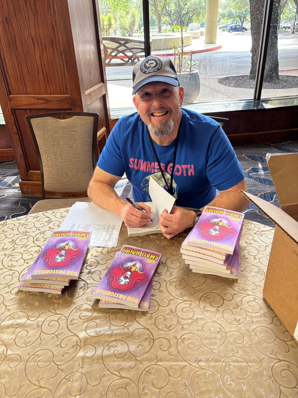 If you pre-ordered a paperback from our webstore, you probably already received it—if not, it's certainly on the way by now. Here's a picture of the author, Bob Pastorella, signing a couple pre-ordered stacks during ArmadilloCon last month month: