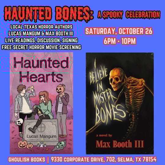 Come celebrate the publication of two new horror books by local Texas authors! Lucas Mangum (HAUNTED HEARTS) and Max Booth III (I BELIEVE IN MISTER BONES) will be performing live readings and then discussing their latest publications (audience q&a encouraged!), followed by a good ol' fashioned book signing. We will close out the night with a FREE, SECRET HORROR MOVIE SCREENING!