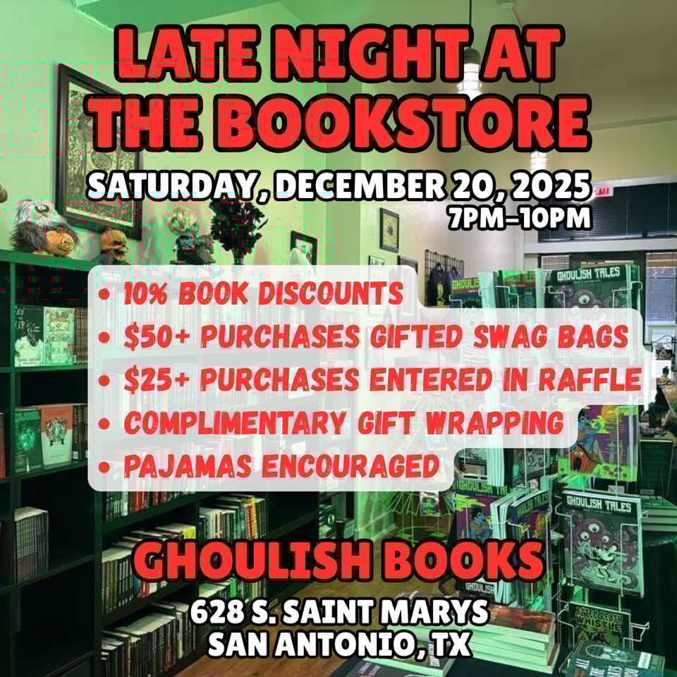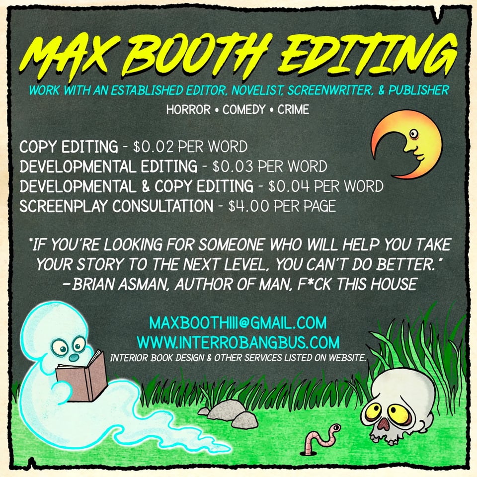 Hello and welcome to the latest issue of The Ghoulish Times. My name is Max Booth and this is my free spooky newsletter for all things GHOULISH. Ghoulish being, of course, Ghoulish Books—the small publishing company I’ve co-operated since 2012, and also the indie bookstore I’ve co-operated since 2023. Nearly my entire adult life, which is weird and scary when you stop and think about it. So, uh, let’s not stop and think about it. Let’s move on immediately!