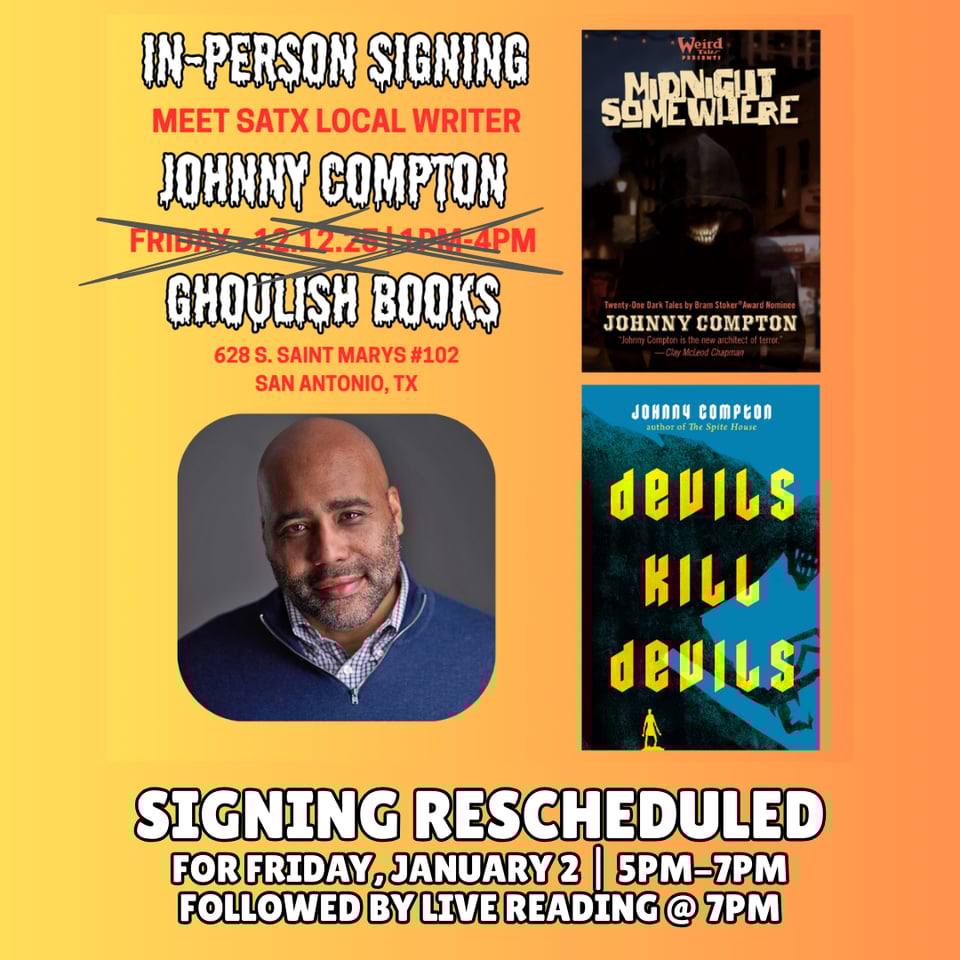 Observers of our social media will already know this, but we had to reschedule this month’s signing with Johnny Compton. You can now find him at Ghoulish Books on Friday, January 2nd, signing copies of his new collection Midnight Somewhere along with his novels Devils Kill Devils and The Spite House. He will be camped out in the lobby with a pen from 5pm-7pm. At 7pm, we will take the event outside behind the shop and host a live reading with Johnny and two other writers TBA for a new edition of our First Friday Frights reading series.