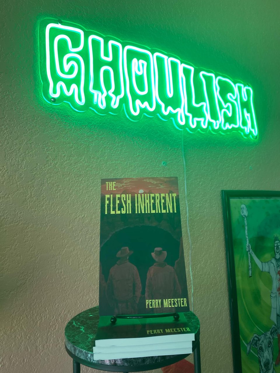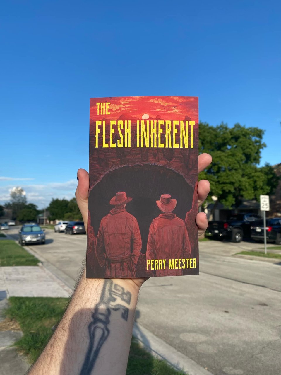 Oh, what a glorious day it is to be a cowghoul! Perry Meester’s gnarly, cosmic body horror, science fiction western, gay-as-fuck novella The Flesh Inherent is finally available! Check out doomed sarcoma’s cover on the physical paperback, currently on proud display in our little retail shop on the outskirts of San Antonio: