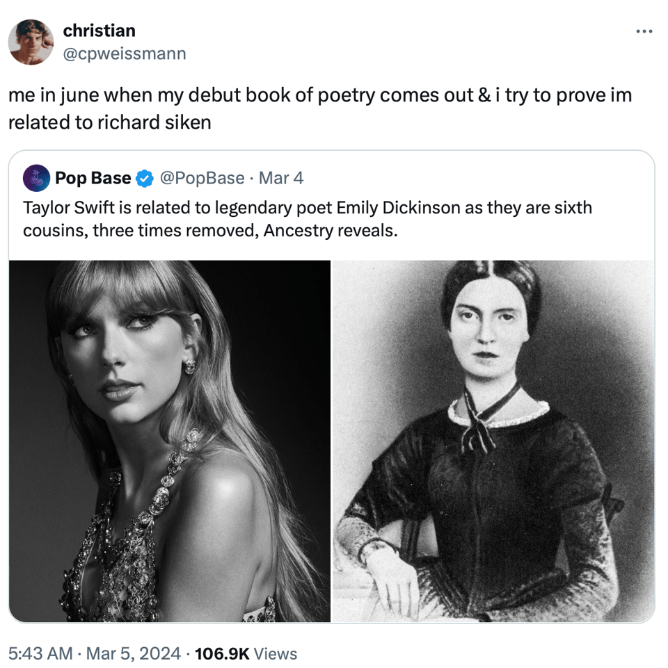Seems fitting to kick off with a bit of Dickinson, since today is World Poetry Day! If you are in around Freddie's this afternoon from 3.30pm, recite a poem and get some free coffee or tea.