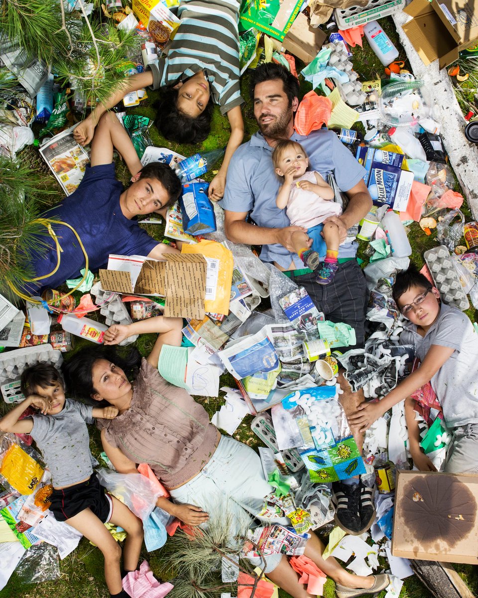 Acht Amerikaanse huishoudens met (het netste deel van) hun huishoudelijke afval van precies één week. Fotograaf Gregg Segal portretteerde hen, liggend op de grond tussen hun eigen zooi, om hun bijdrage aan het wereldwijde afvalprobleem in beeld te brengen.