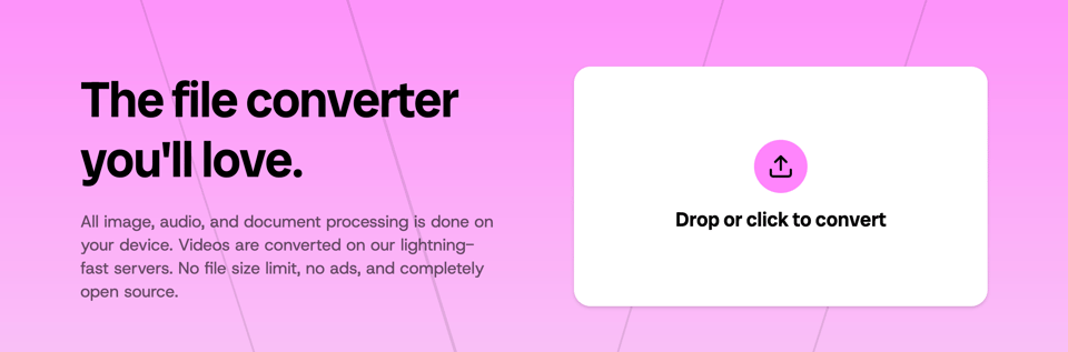 All image, audio, and document processing is done on your device. Videos are converted on our lightning-fast servers. No file size limit, no ads, and completely open source.