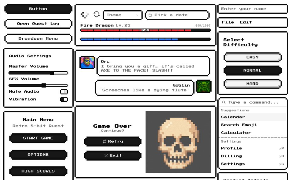 A set of 8-bit styled components and a code distribution platform. Works with your favorite frameworks. Open Source. Open Code.
