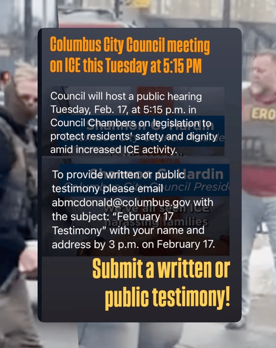 Columbus City Council will host a public hearing Tuesday, Feb. 17, at 5:15 p.m. in Council Chambers on legislation “to protect residents’ safety and dignity amid increased ICE activity.”