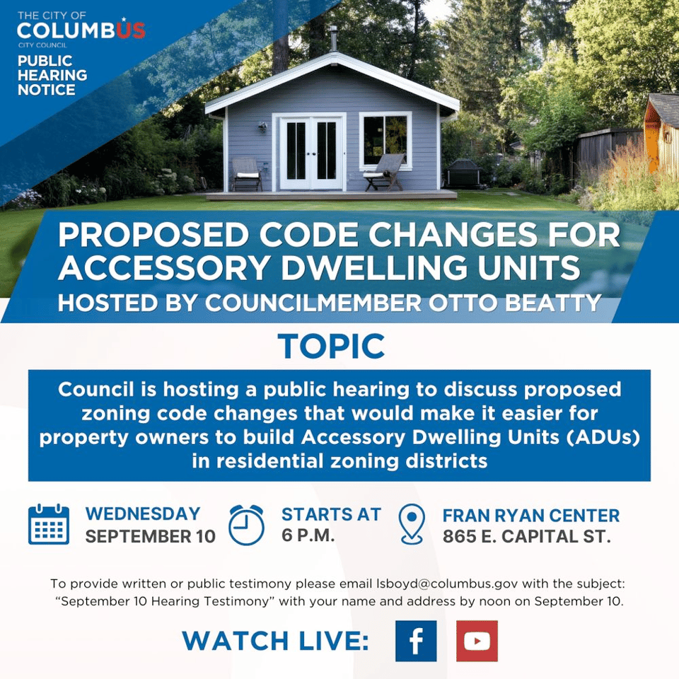 Councilmember Otto Beatty III will hold a second public hearing on proposed zoning code updates that would allow Accessory Dwelling Units in residential neighborhoods. Come share your thoughts