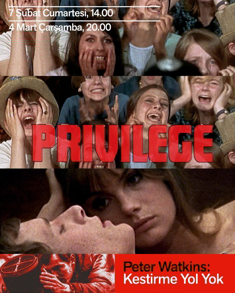 7 Şubat Cumatesi günü 14.00’te ise Peter Watkins’in tek stüdyo filmi olan Ayrıcalık’a (Privilege) bekleriz. Film, devlet tarafından kontrol edilen bir pop yıldızının önce gençliğin isyan duygularını dışa vurması için kullanılması, ardından da itaatkarlığın sesine dönüşmesini konu alıyor. Watkins’in hem totaliterliğe dair imgeler yaratma konusundaki hünerini sergilediği hem de mizaha yer açtığı filmi, bizce akla Brady Corbet’nin 2018 tarihli Vox Lux’ını getiriyor. Stanley Kubrick’in de Otomatik Portakal’da bu filmden etkilendiği de biliniyor. Film, Watkins üzerine önümüzdeki günlerde yayımlayacağımız kitaba da katkıda bulunan Fırat Yücel’in sunumuyla açılacak. Biletler Mobilet’te.
