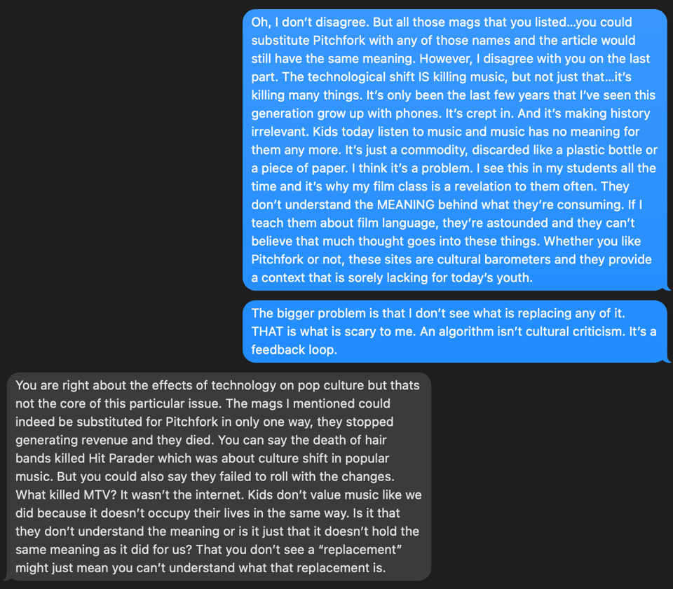 Not everyone enjoys websites like Pitchfork, but there is a place for these sites in the world and I think that we're in a pretty precarious place in terms of what comes next. My best friend since middle school, Chris, and I had a little text debate yesterday about what this all means. He said, very rationally: