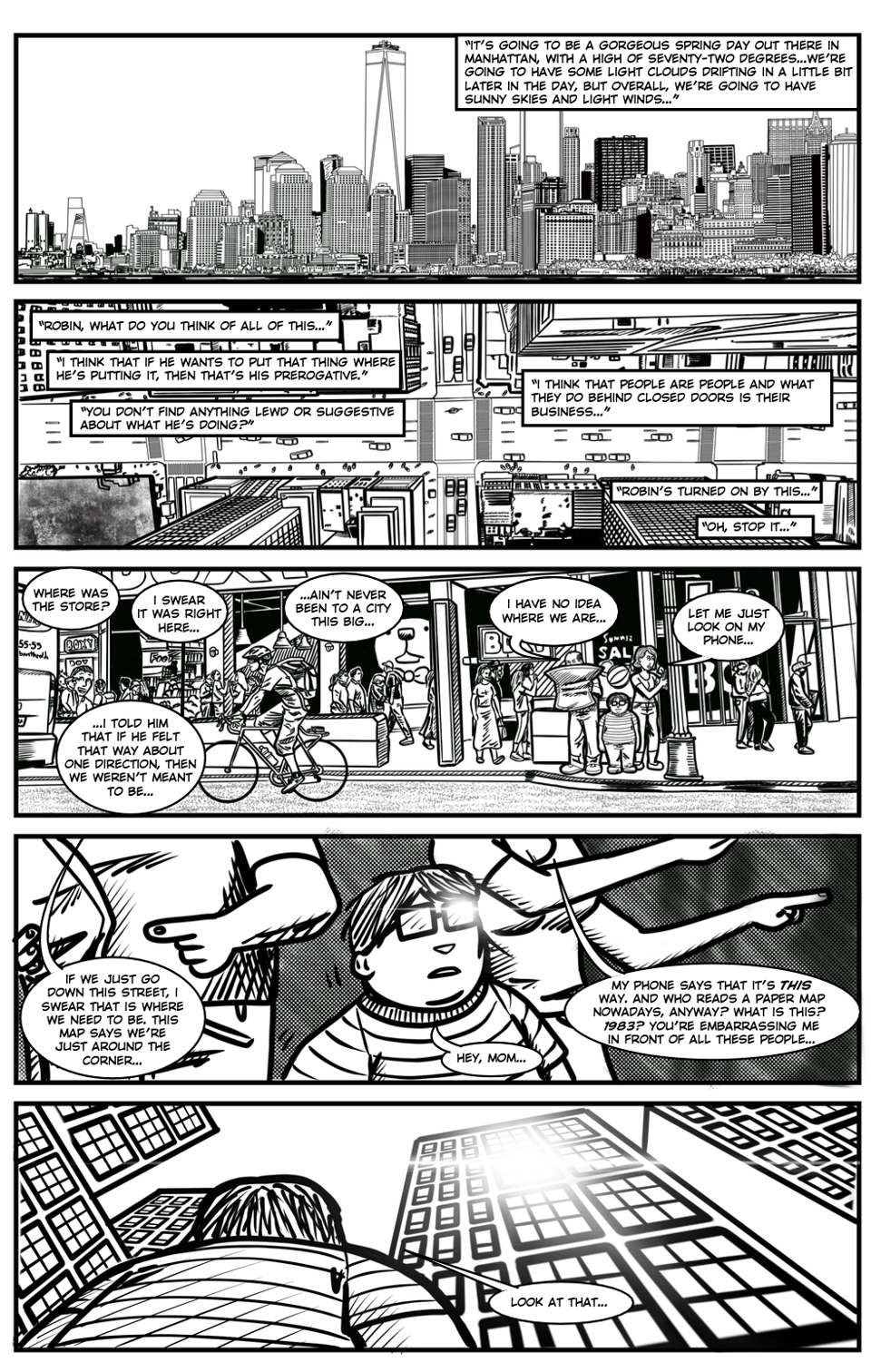 The little boy that I drew is god awful. And there are other problems. It's easy to see where I spent a great deal of time (the third panel is me at my best). The fourth and fifth panel is me just wanting to get something done. Because I worked on this page on different days, the quality varies. And, as you know, I have a day job. What you see is what I was able to do when I had the time.