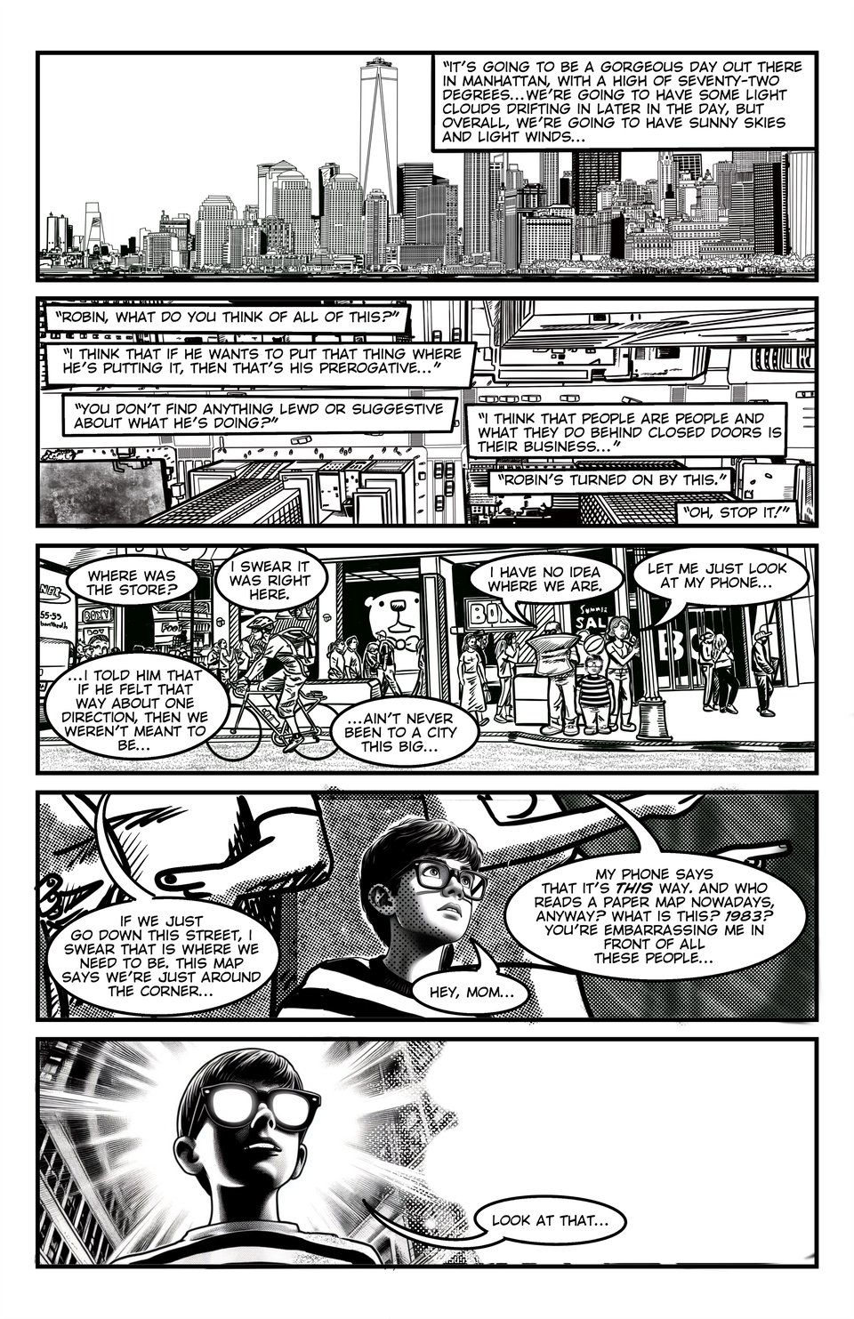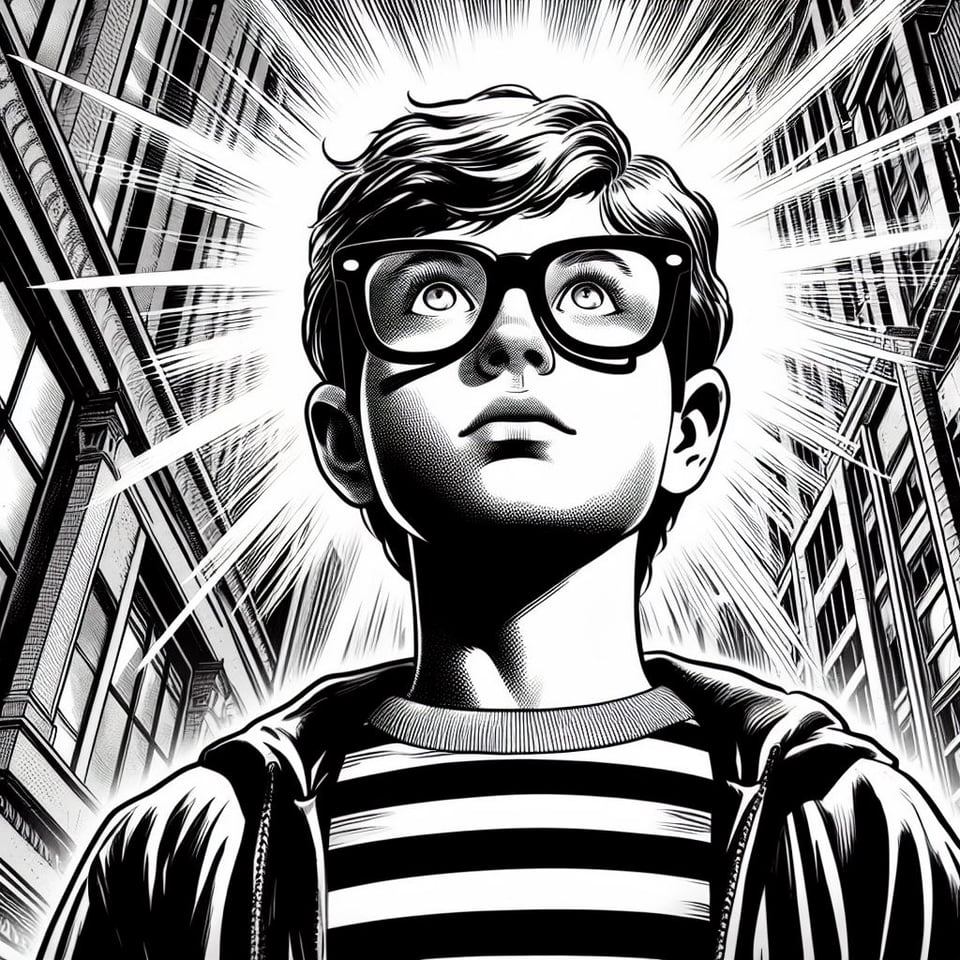Create a wide-screen, black and white comic book image in the style of arthur adams of a young boy, standing on the streets of Manhattan. The boy should be wearing a striped shirt and thick, black glasses that obscure his eyes. It should be a medium shot of the boy, with his father on his right and his mother on his left and both of them should be pointing away from him in different directions. A reflection of a light above him should be in the boy's glasses.