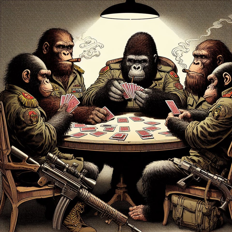 Create a comic-book drawing in the style of Arthur Adams of a group of apes (orangutans, baboons, gorillas, and chimpanzees) all sitting around a round table, playing cards. Each of them should be dressed in the same type of futuristic military uniform and large weapons should be resting casually around them. The biggest ape should be the gorilla, who is seated in the center of the picture. He is smoking a cigar and looking at the cards in his hands. The apes are illuminated by a single light above them, with a square-shaped, brown shade. They are in an apartment that is crumbling from years of neglect.