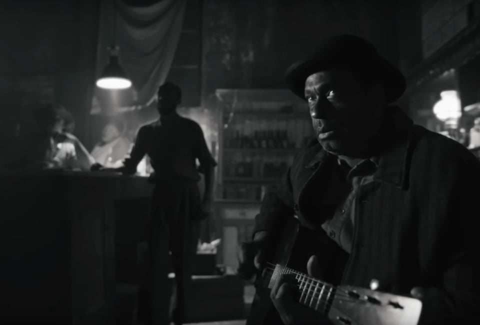 Look at the lighting and composition of this shot. Everything about this is well-composed, from the silhouette of the man at the bar, to the chiaroscuro lighting on the guitarist’s face, to the light behind the guitarist. And it appears for about two seconds. Brilliant work.
