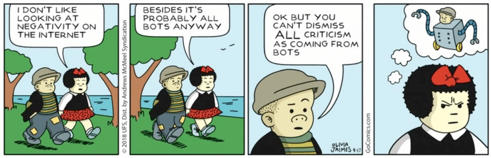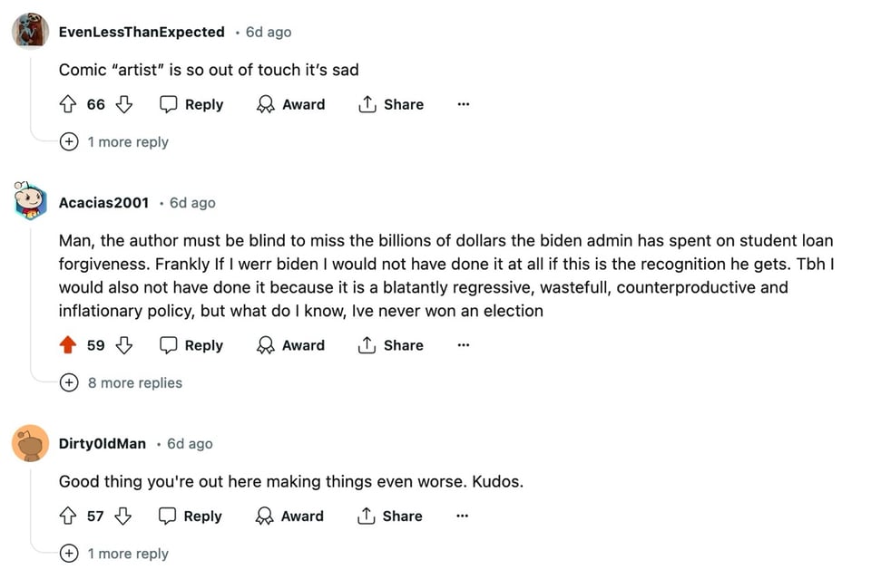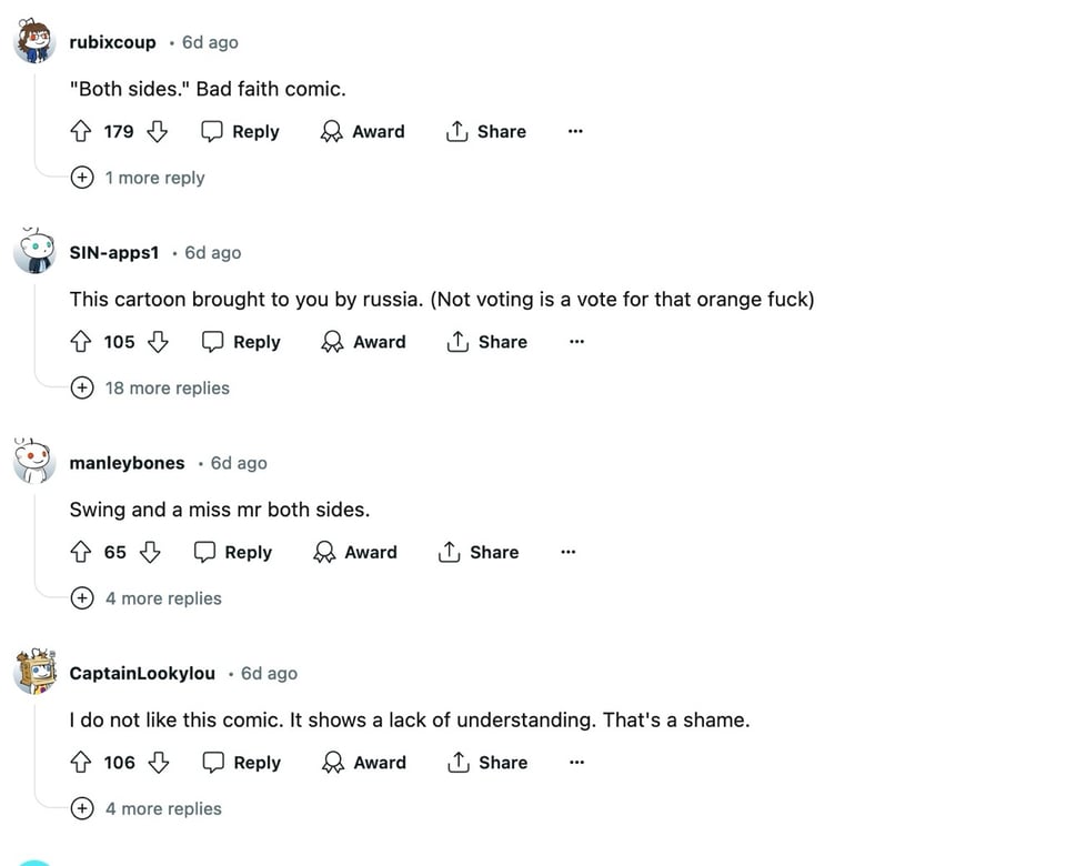 This is the internet. This is what happens when you put stuff out there. I have many theories about why this comic took off the way it did. One is that it got posted in some pro-Joe Biden forum and the people got all riled up. I also have a theory (and this is stretching, but I think it’s a real possibility) that this comic got hit by a Russian comment farm.