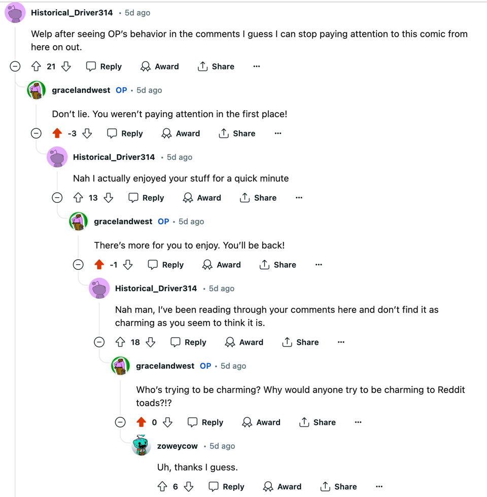 Additionally, it was only confined to Reddit. They didn’t post anywhere else, even though the links are in my bio. And the commenters flooded in for one particular comic and really didn’t appear again. There were a few comments on the next couple of strips (like a viral infection, they stick around for a couple of days before they’re really gone), but aside from that, it’s back to business as usual on Reddit.