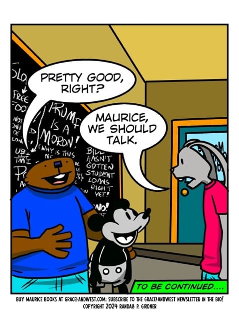 Here’s a strip from this week’s Maurice Comics. We now have a new character in the strip. Some of you might recognize him as one who has just come into the public domain: