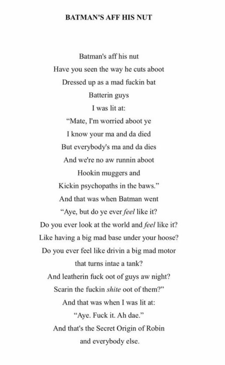 Here’s a poem for you today to make you feel better. It’s called “Batman's Aff His Nut” by Scottish poet Robert Florence.