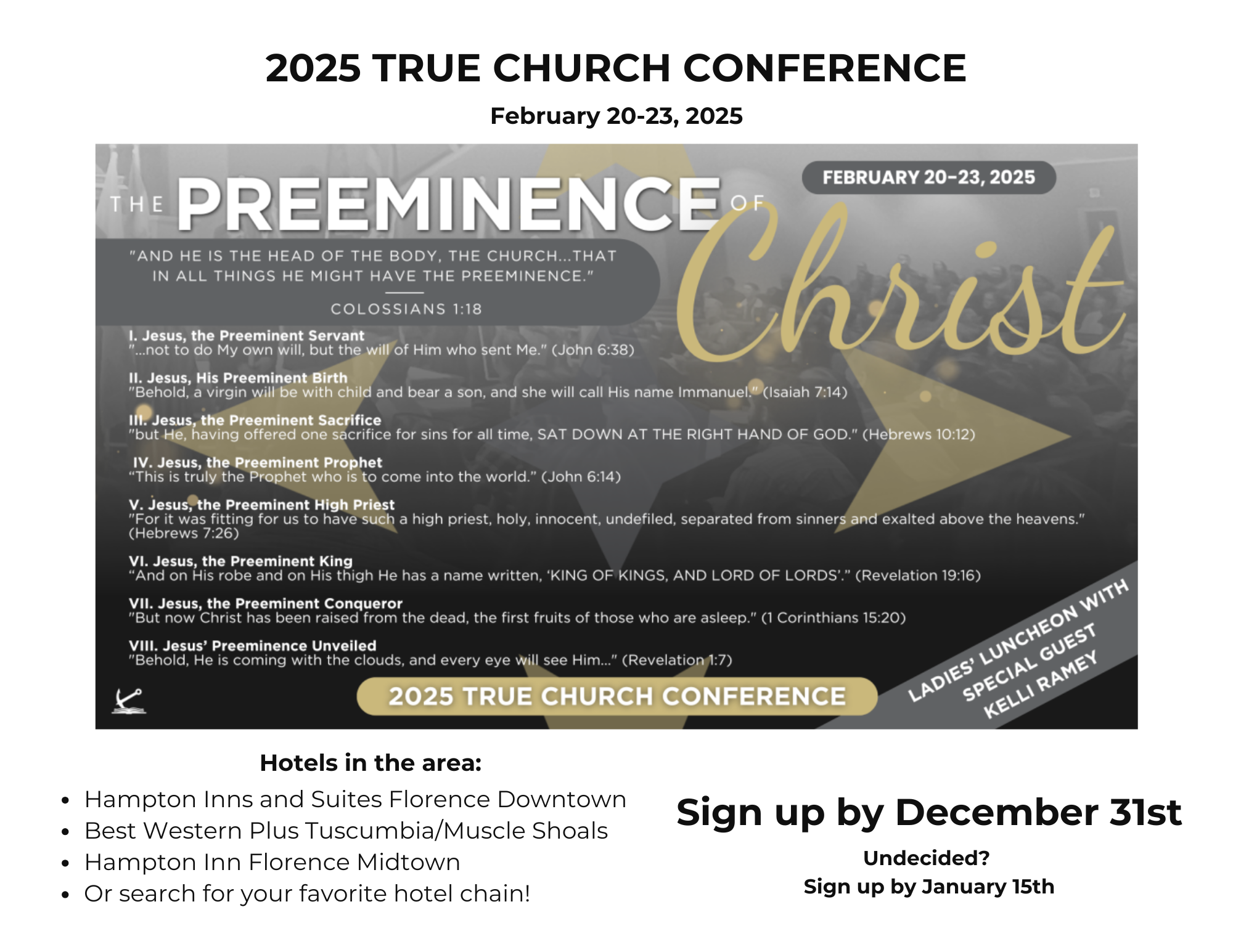 It is time to sign up for the 2025 True Church Conference in Muscle Shoals, AL. The cost is $65 per person if we sign up by December 31st. After the 31st, the price increases to $85 per person. The church will cover the cost of the conference.