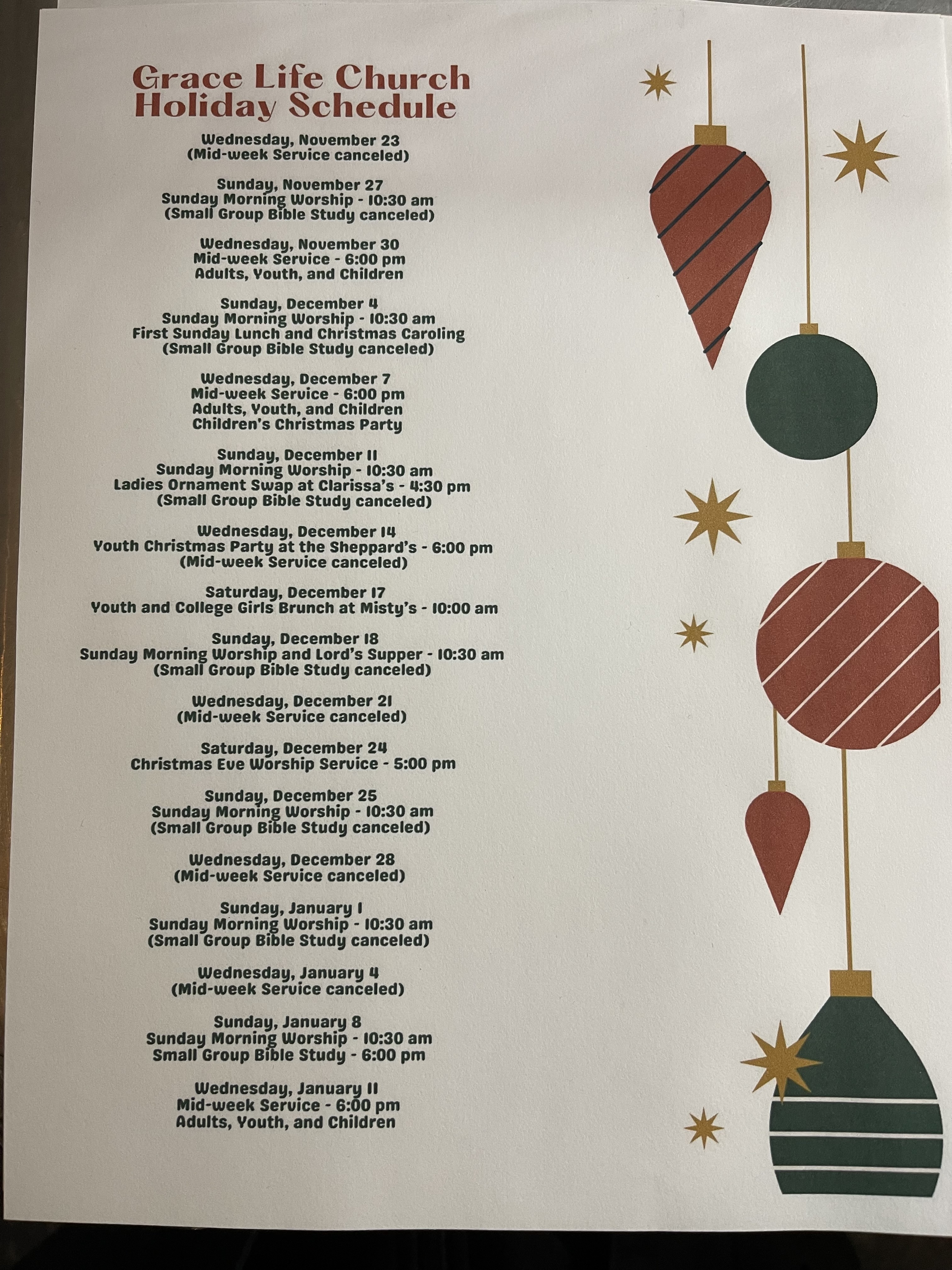 Greetings, church! See attached for a copy of our holiday schedule.