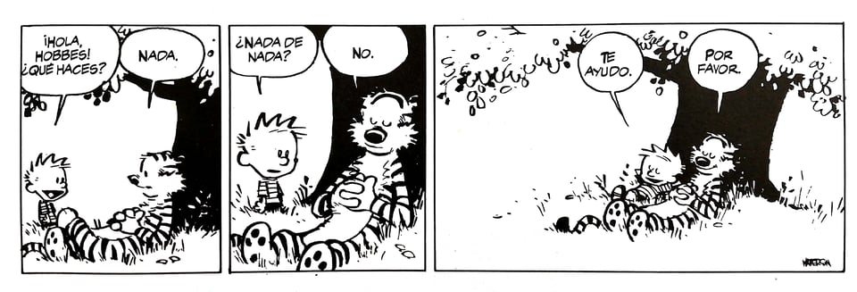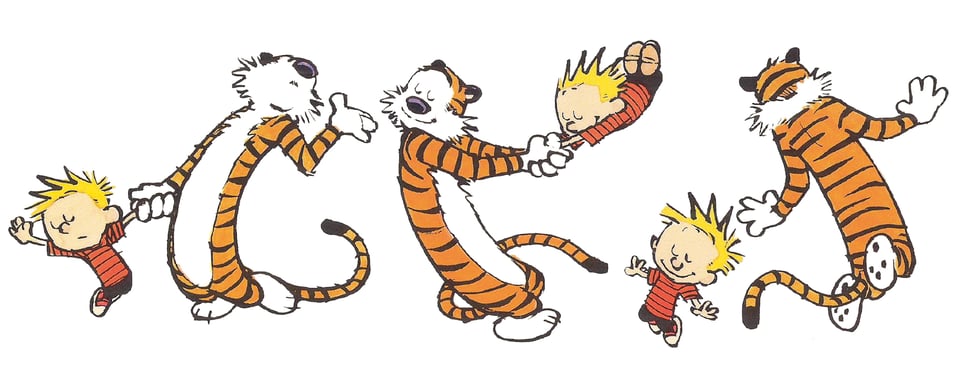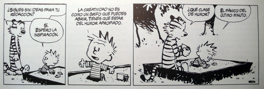 Si eres uno de nuestros lectores jóvenes, igual no conoces a Calvin y Hobbes, acabo de caer en la cuenta. Si te ha picado la curiosidad y te decides a investigar, que sepas que te envidio mucho. La editorial Astiberri está publicando ahora mismo tomos recopilatorios, y seguro que en tu librería o biblioteca local puedes echarle un ojo.