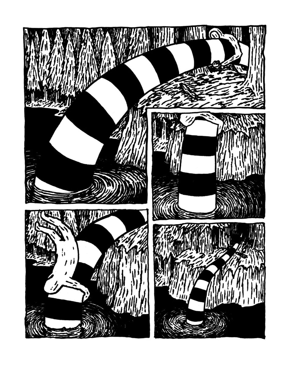 Honorable mentions, if only because I can keep listing comics all day: The Boy in Question by Michael DeForge (Space Face Books, 2013); Eight-Lane Runaways by Henry McCausland (Fantagraphics, 2020); Clearwater by Aaron Losty (self-published, 2024); Coyote Doggirl by Lisa Hanawalt (Drawn and Quarterly, 2018).
