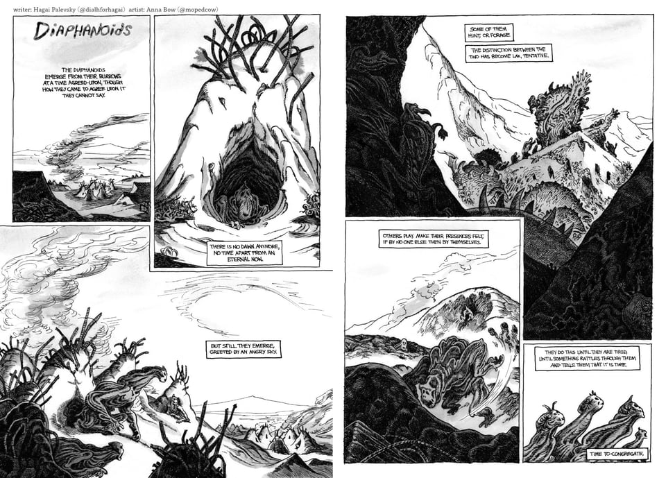I posted a new comic a last week, titled “Diaphanoids,” drawn and lettered by the tremendous Anna Bow. Anna has been a favorite of mine for some time now, ever since I read her graphic novel with Sloane Leong, Graveneye (TKO, 2021), and when she told me she wanted to make a comic together I obviously leapt at the opportunity. I’m very fond of how this one came out — Anna had initially sent me a list of potential directions, and Phil Tippett’s transcendent movie Mad God was on there, and somehow I gravitated toward that one. There’s some Michael DeForge in there as well, as I suspect there often is in my recent writing. There is something fun about writing a truly incorrigibly fucked situation.