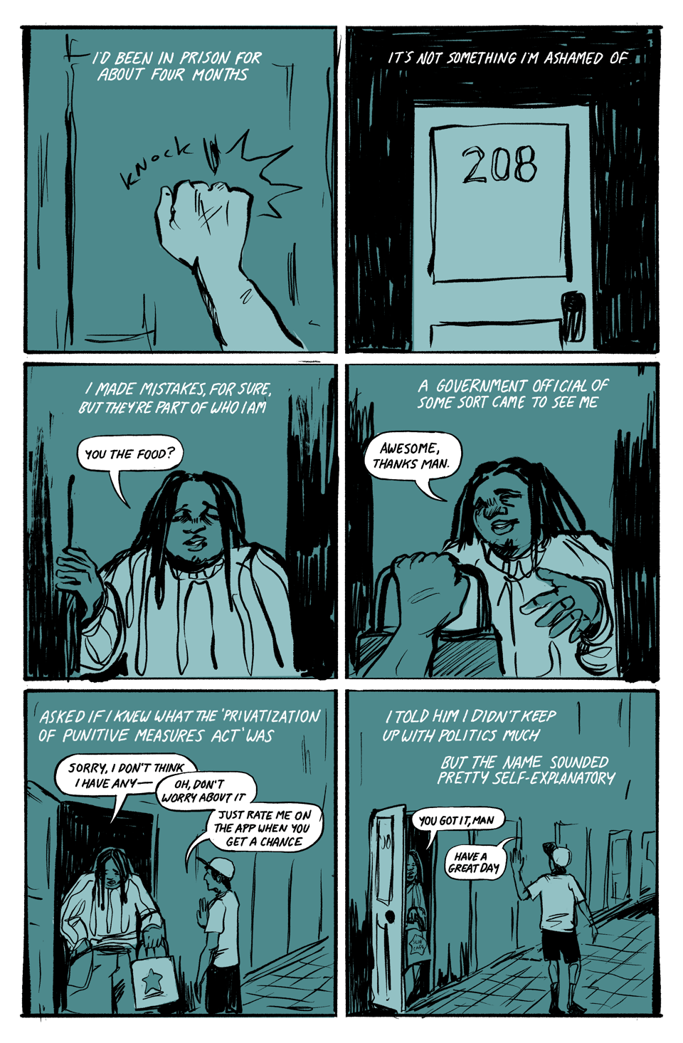 In July I posted the fifth comic of 2025, “Out for Delivery” drawn by Evangeline Gallagher. Longtime Hagai readers will of course remember that Evangeline and I previously did another comic together, 2022’s “The Beauty of Our Weapons,” and getting to work with them again was a blast; I think we both leveled up in our respective work, and I’m very fond of the result, which can be read on Bluesky and on Itch. Here’s the first page (of eight):