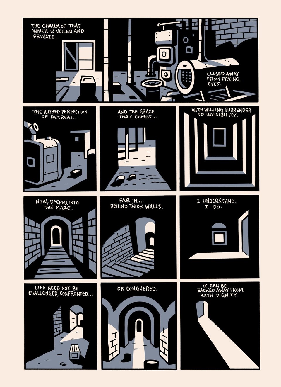 I can’t remember if I wrote this previously, but Seth is an interesting cartoonist — for years I had some kneejerk aversion to him simply because I dismissed that milieu of cartoonist to be ‘pretentious’ and largely anathema, and Clyde Fans in particular I remember some people deriding as “sad white man comics” when it came out. But the more I read of him the less convinced I was of my own dismissals. Well, I finally read this one—on my birthday, because I thought it would be funny to spend so much of my birthday reading a rather hopelessly bleak book—and, honestly, it’s beautiful. There’s an inherently beautiful thing, I think, about a project taking so long that you can see the changes in the artist’s hand over time, and to me Seth’s cartooning only gets better with time; I like the thick, chunky lines of his latter-day style a lot better than the Newyorkerisms of his ‘90s work. Plus, the fifth chapter features what to me is a clear (prolonged) riff on The Cage by Martin Vaughn-James — one of the best works of art in any art-form. Having now read all of his major works, I am largely convinced that Seth is one of the best cartoonists of all time, a really striking articulator of humanity, and this is quite probably his best work.