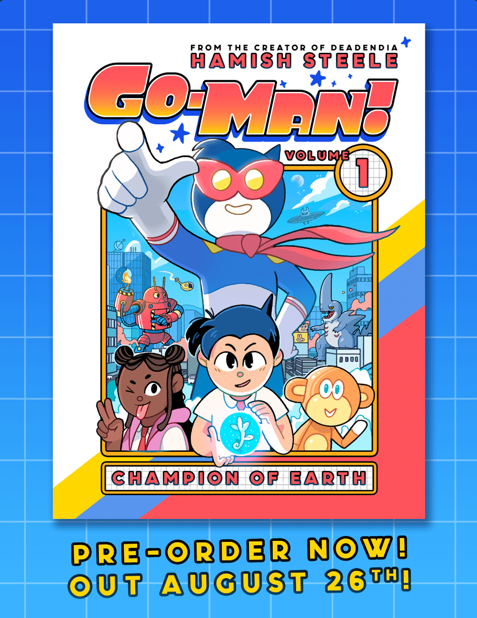 GO-MAN: CHAMPION OF EARTH (Volume 1) will be out in the US, Canada (and I believe UK?) on August 26th 2025. It may be available elsewhere too, but it’s only coming out in English first.
